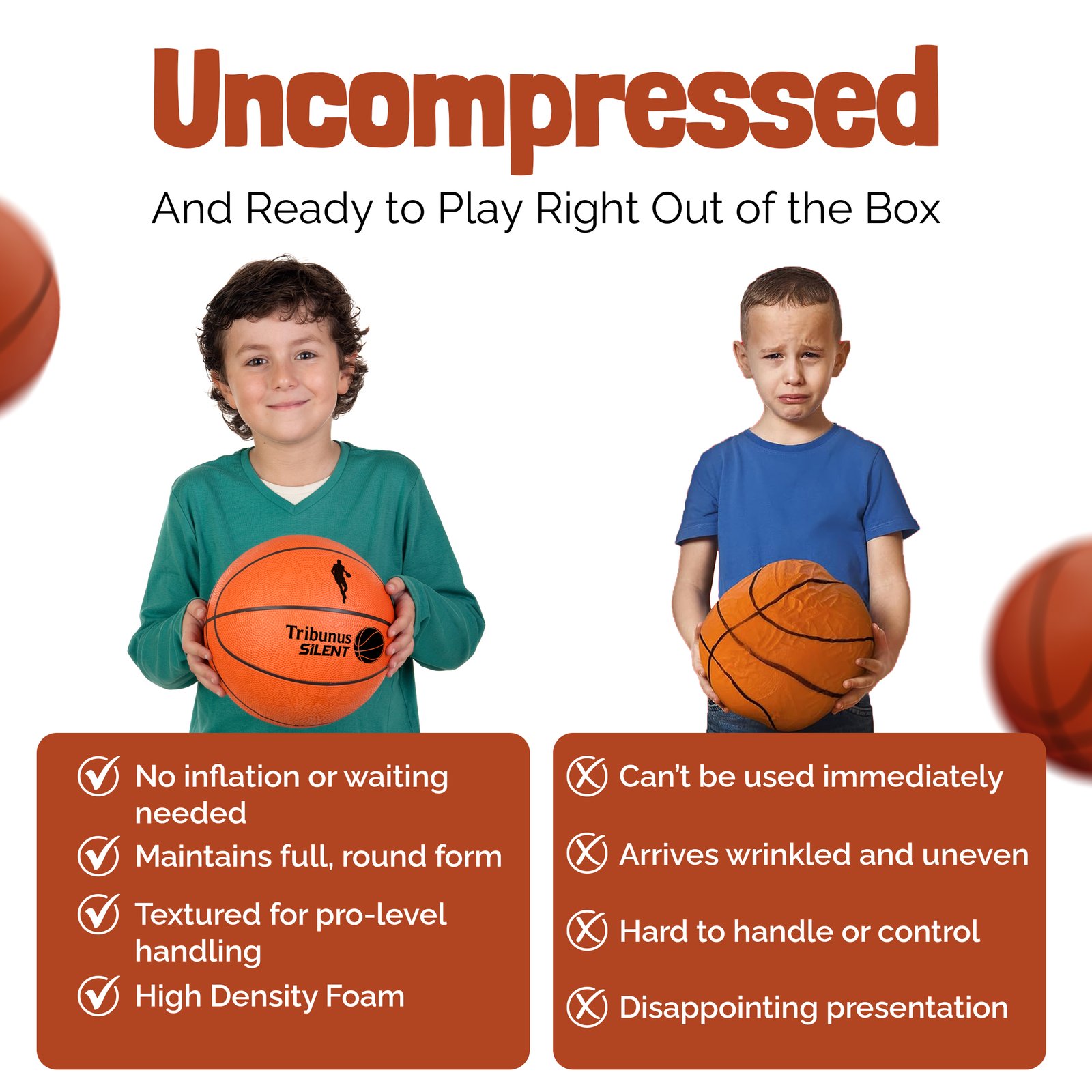Many of our competitors deliver basketballs that are vacuum packaged, needing days to reach full shape. Our basketball arrives in an aesthetic box packaging, ready to play right out of the box.